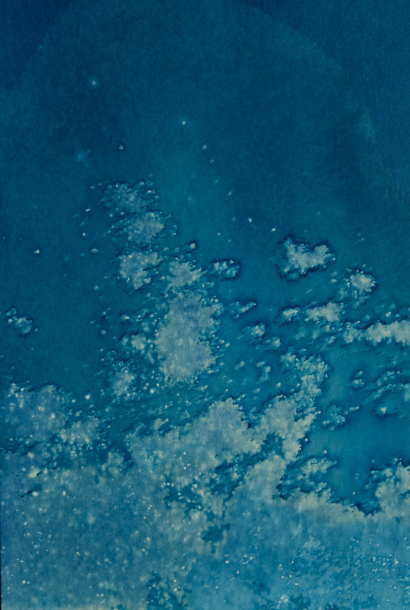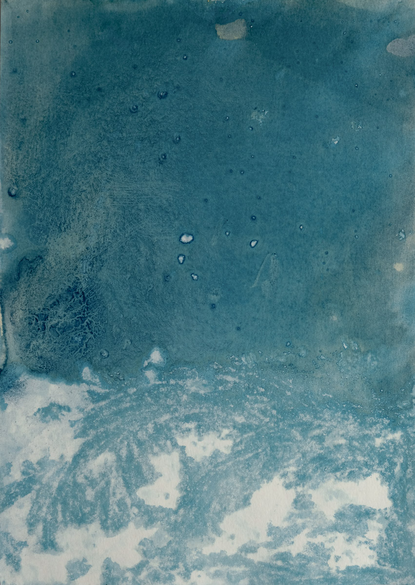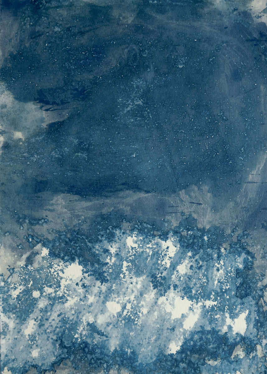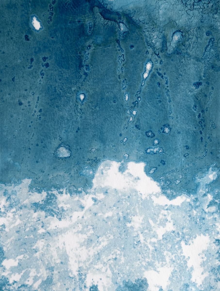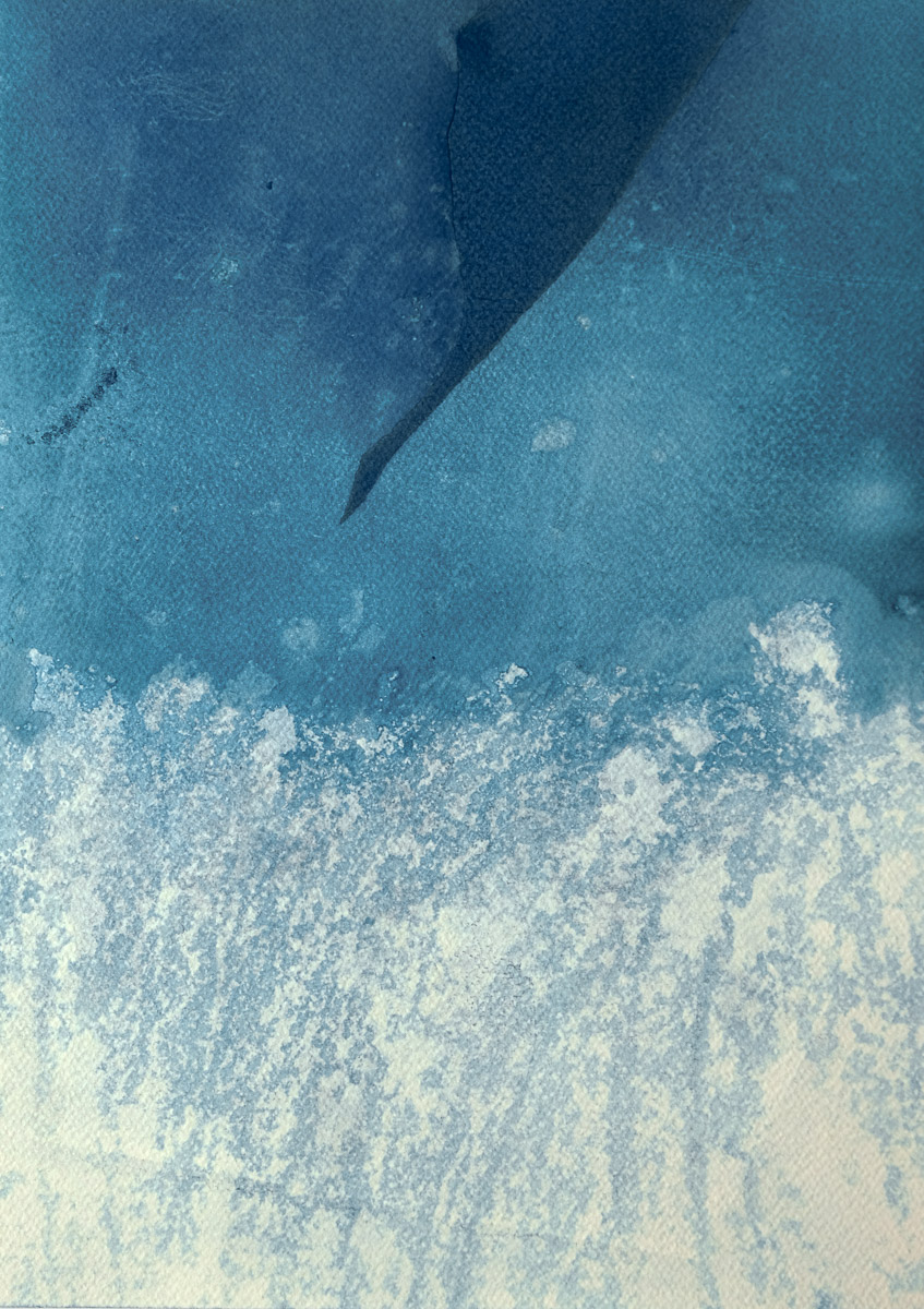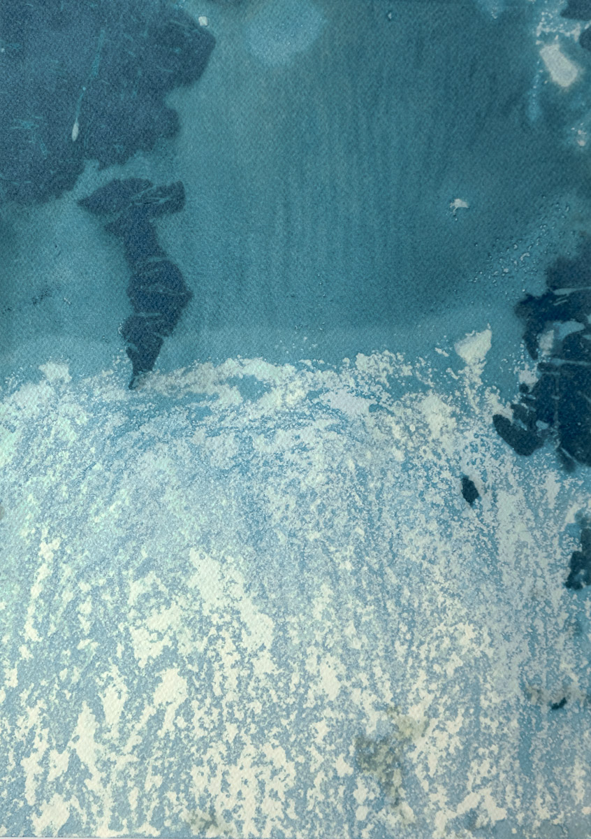 Turbulence is made with the technique of cyanotype, applied in places between the ocean and the beach, without the use of a camera, but through the direct collection of the imprints of the waves, the sands, the debris on the treated paper. It is a slow process that takes several days and requires long exposure to sunlight to fix the stories written by the ocean. Each resulting print is unique.