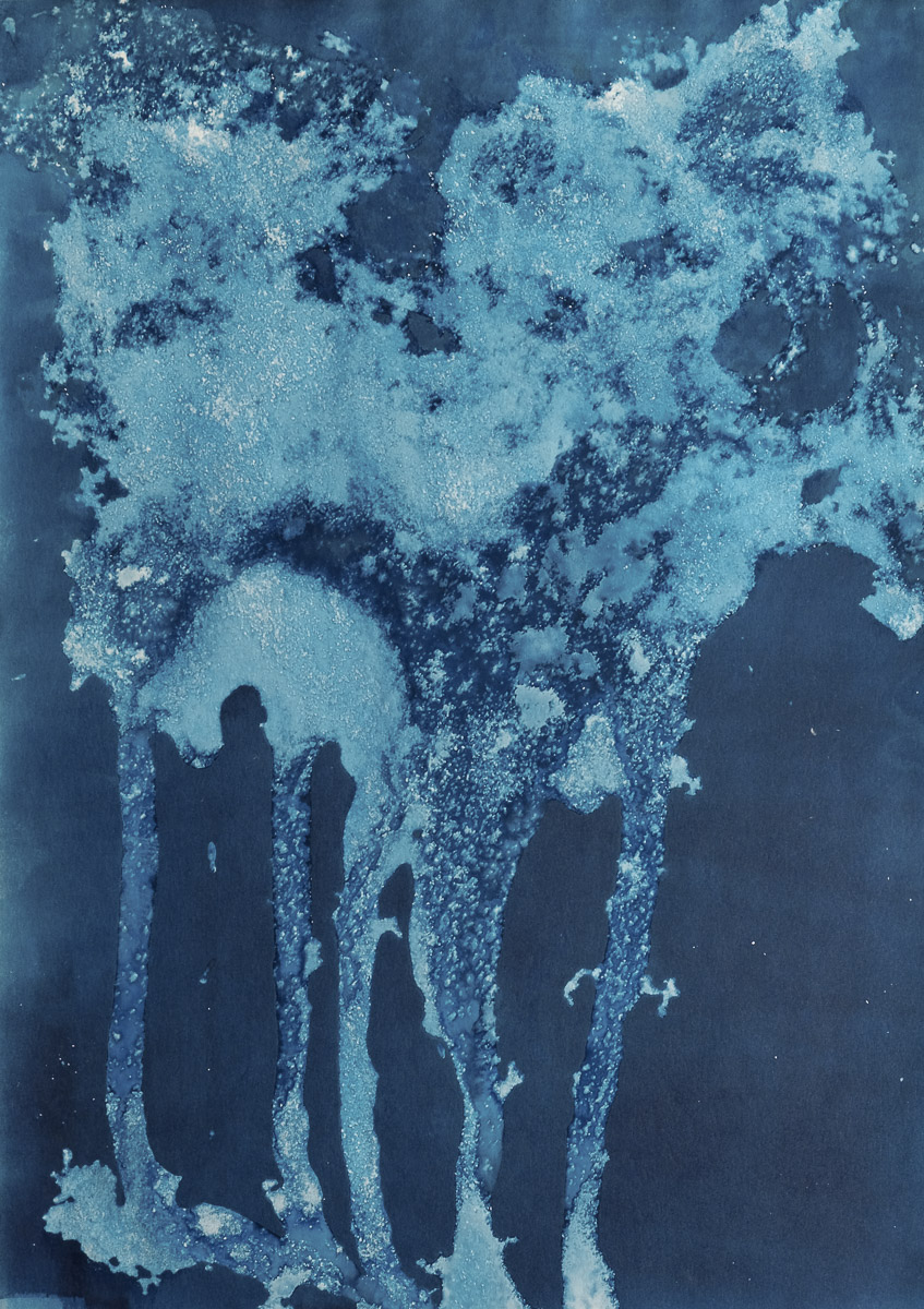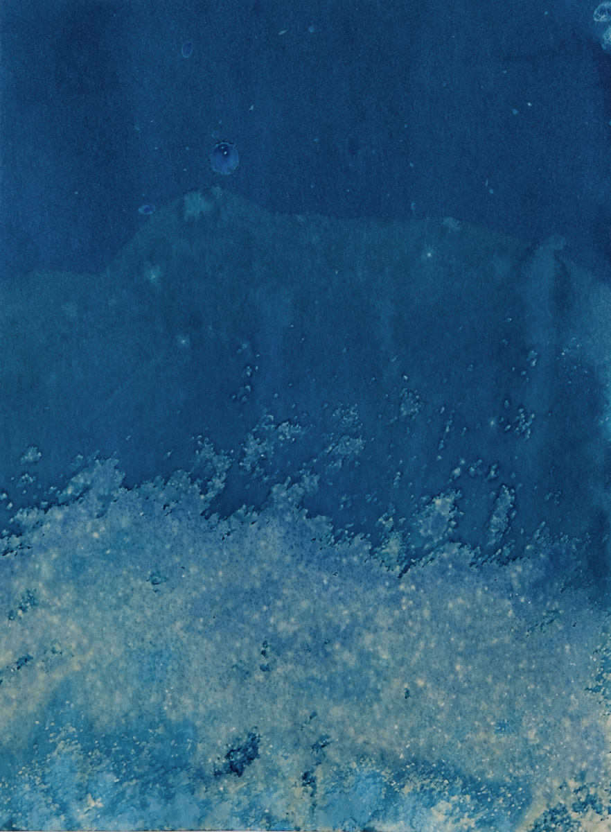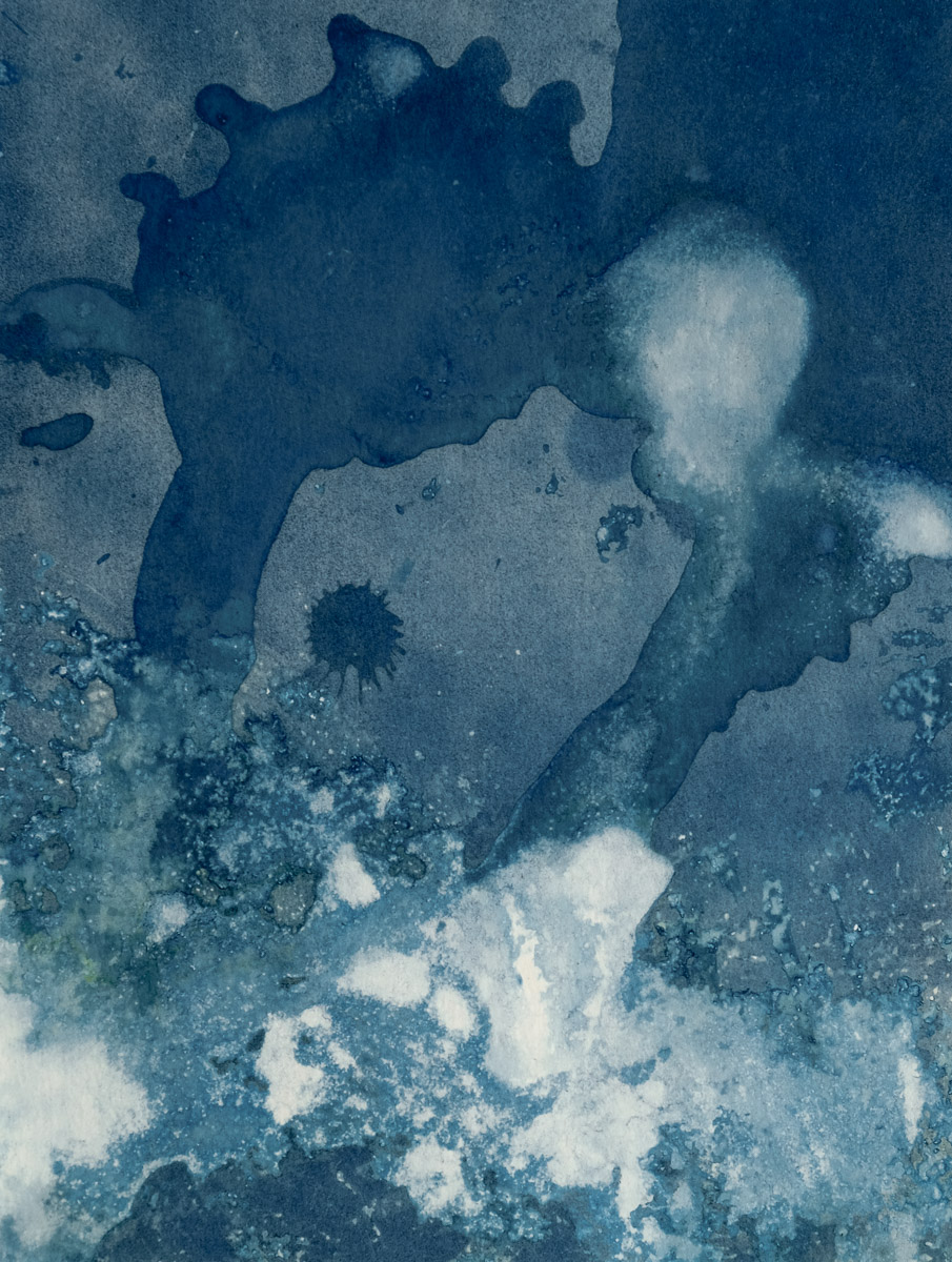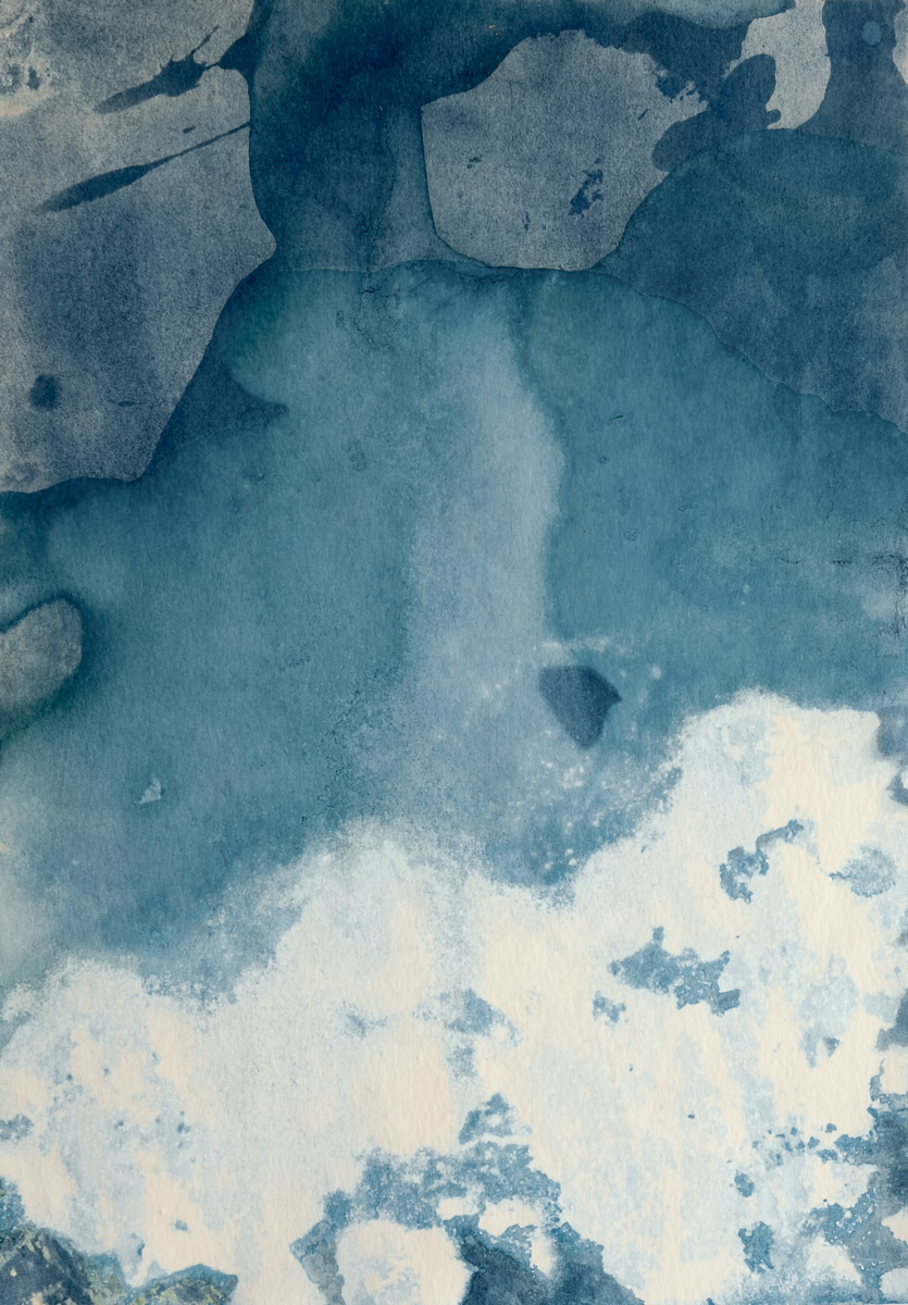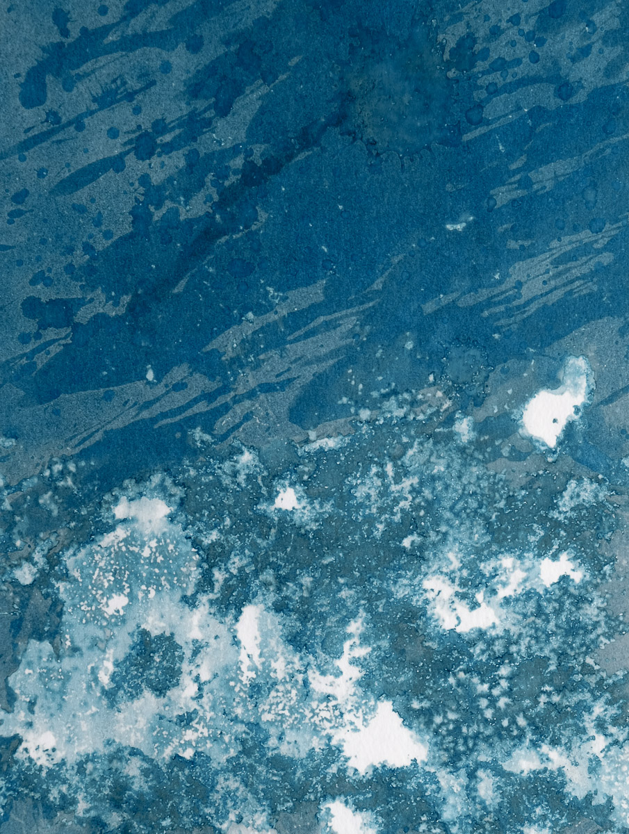 Turbulence is made with the technique of cyanotype, applied in places between the ocean and the beach, without the use of a camera, but through the direct collection of the imprints of the waves, the sands, the debris on the treated paper. It is a slow process that takes several days and requires long exposure to sunlight to fix the stories written by the ocean. Each resulting print is unique.