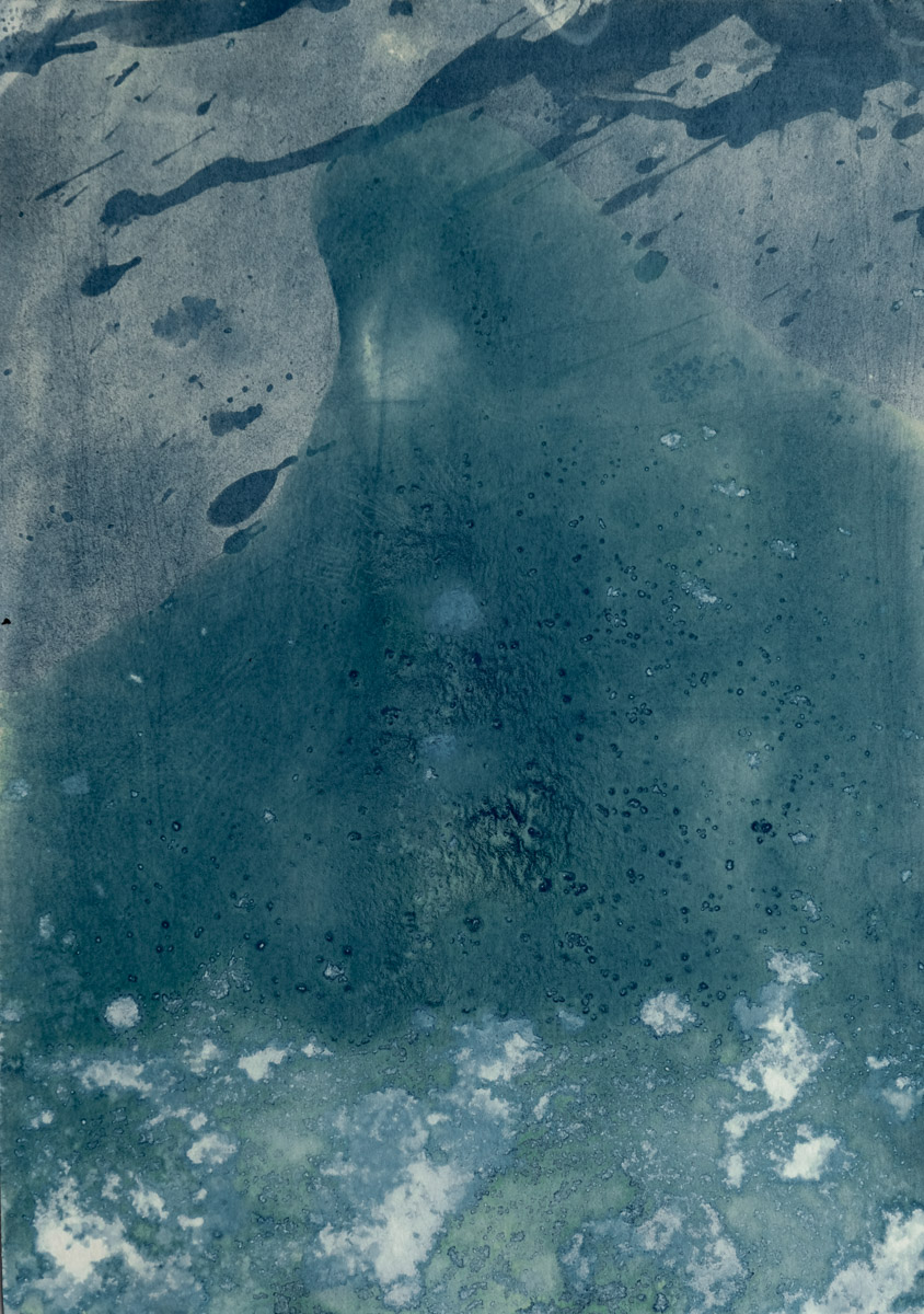 Turbulenceè realizzato con la tecnica della cianotipia, applicata in luoghi tra l’oceano e la spiaggia, senza l’utilizzo della macchina fotografica, ma attraverso la raccolta diretta delle impronte delle onde, delle sabbie, dei detriti sulla carta trattata. È un procedimento lento che dura diversi giorni e richiede lunghi tempi di esposizione ai raggi solari per fissare le storie scritte dall’oceano. Ogni stampa così ottenuta è unica.